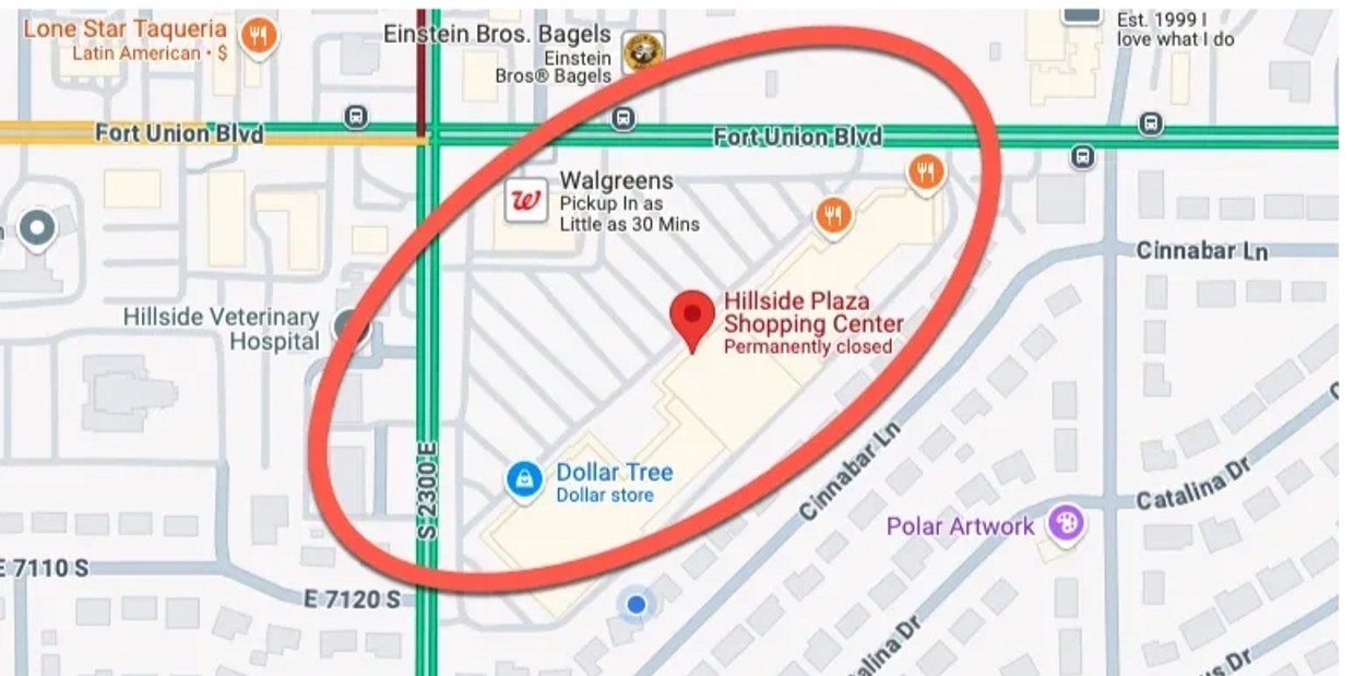 View of 'The Heights' looking at the corner of 2300 E and Ft. Union Blvd. The open space is for gathering and hanging out. Notice the buildings have places for roof top dining and for sidewalk dining The amphi theater is for small performances. The area at the top can be closed off for farmers markets, and other events.